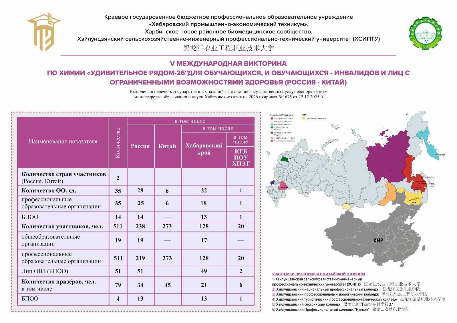 Организаторами Викторины: КГБ ПОУ ХПЭТ, Харбинское новое районное биомедицинское сообщество, Хэйлунцзянский сельскохозяйственный инженерный профессионально-технический университет ООО «Харбин Бейкэ здоровье и технологии».